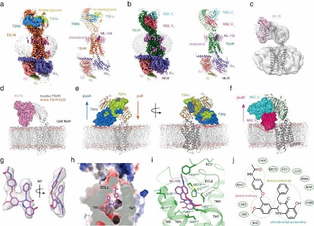 综上,本研究系统性地研究了TSHR与内源性激素TSH和小分子激动剂ML-109的结构,首次揭示了激素TSH和别构激动剂ML-109诱导受体激活的机制;通过解析激活型抗体M22和抑制型抗体K1-70与TSHR的结构,揭示了TSHR 如何被自身免疫性抗体激活或抑制的结构基础,从而为针对TSHR功能异常从而引发的自身免疫性疾病的抗体药物和小分子药物发现提供了更加清晰地模板和思路。