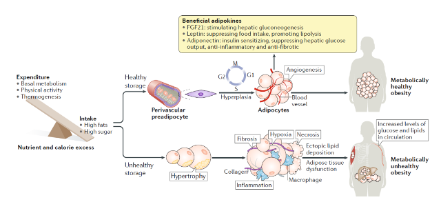 脂肪组织可以通过增生(hyperplasia)和肥大(hypertrophy)两种方式增长体积,同等程度的体积增长,若是通过肥大的方式,不仅体重增加,代谢性疾病的风险也增加;若是通过脂肪前体细胞(Adipocyte Progenitor cells)分化增生的方式,则可以在体重增加的情况下降低和延迟代谢性疾病的发展。