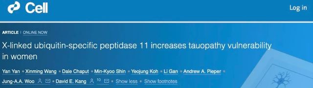 原文出处:Yan Y, Wang X, Chaput D, Shin MK, Koh Y, Gan L, Pieper AA, Woo JA, Kang DE. X-linked ubiquitin-specific peptidase 11 increases tauopathy vulnerability in women. Cell. 2022 Sep 22:S0092-8674(22)01124-2. doi: 10.1016/j.cell.2022.09.002. Epub ahead of print. PMID: 36198316.