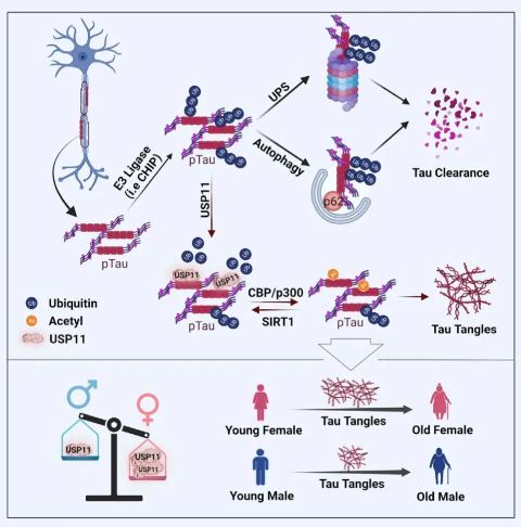 该研究将USP11确定为对人类和小鼠tau蛋白病变产生强烈的女性偏倚效应的DUB,这为女性从临床前阶段开始就更容易发生tau蛋白病变提供了新的机制基础。