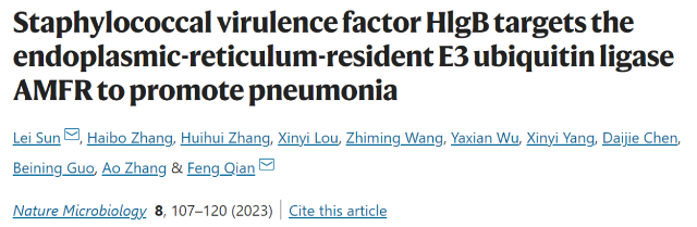 原文出处:Sun L, Zhang H, Zhang H, Lou X, Wang Z, Wu Y, Yang X, Chen D, Guo B, Zhang A, Qian F. Staphylococcal virulence factor HlgB targets the endoplasmic-reticulum-resident E3 ubiquitin ligase AMFR to promote pneumonia. Nat Microbiol. 2023 Jan;8(1):107-120. doi: 10.1038/s41564-022-01278-7. Epub 2023 Jan 2. PMID: 36593296.