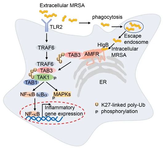 分子机制研究发现,MRSA通过其毒力因子HlgB诱导AMFR与胞内信号分子TAB3相互作用,通过TAB3上第649位赖氨酸,引起TAB3的K27位的泛素化修饰,激活下游信号分子TAK1和NF-kB信号通路。