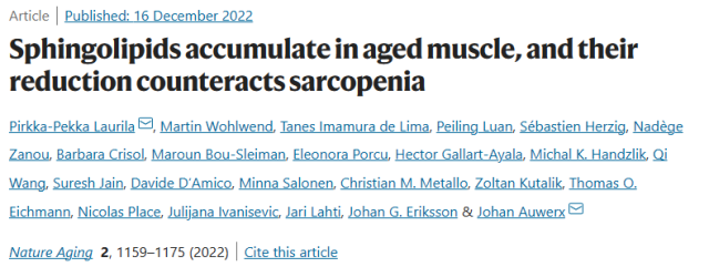 原文出处:Laurila, PP., Wohlwend, M., Imamura de Lima, T. et al. Sphingolipids accumulate in aged muscle, and their reduction counteracts sarcopenia. Nat Aging 2, 1159–1175 (2022). https://doi.org/10.1038/s43587-022-00309-6