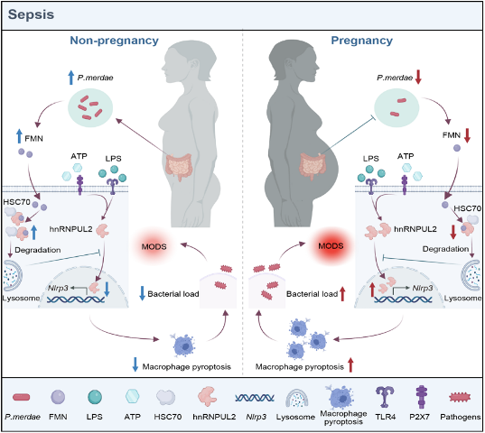 该研究揭示了孕产妇体内“P. merdae—FMN—hnRNPUL2”的微生物免疫轴在脓毒症期间的重要生物学意义,为开发妊娠期脓毒症所致的免疫紊乱的精准治疗方案提供了新的策略。