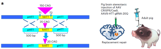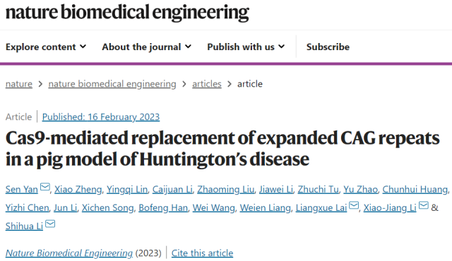 原文出处:Yan S, Zheng X, Lin Y, Li C, Liu Z, Li J, Tu Z, Zhao Y, Huang C, Chen Y, Li J, Song X, Han B, Wang W, Liang W, Lai L, Li XJ, Li S. Cas9-mediated replacement of expanded CAG repeats in a pig model of Huntington's disease. Nat Biomed Eng. 2023 Feb 16. doi: 10.1038/s41551-023-01007-3. Epub ahead of print. PMID: 36797418.