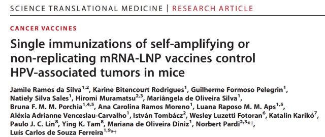近日,圣保罗大学、宾夕法尼亚大学、Acuitas公司、BioNTech公司的研究人员合作,在 Science Translation Medicine 期刊发表了题为:Single immunizations of self-amplifying or non-replicating mRNA-LNP vaccines control HPV-associated tumors in mice 的研究论文。