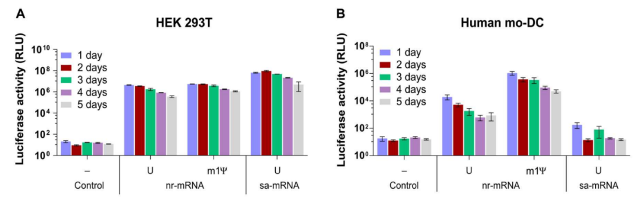 mRNA疫苗可以分为非复制型mRNA(nr-mRNA)疫苗和自复制型mRNA(sa-mRNA)疫苗。nr-mRNA疫苗编码抗原的表达水平会随时间流逝而不断降低。相比之下,sa-mRNA添加了来自甲病毒的复制酶序列,在进入细胞后可以自我复制,从而延长表达抗原的时间,也降低使用剂量。