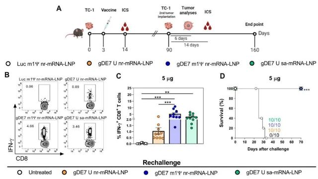 研究结果表明,三种gDE7 mRNA疫苗中的任何一种,在单次、低剂量接种后,都能诱导E7特异性CD8+ T细胞的激活,产生能够预防肿瘤复发的记忆T细胞反应,并根除不同生长阶段的皮下肿瘤,甚至即使是在生长晚期也能控制肿瘤进展。