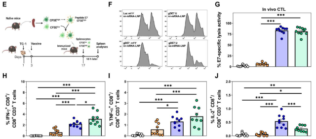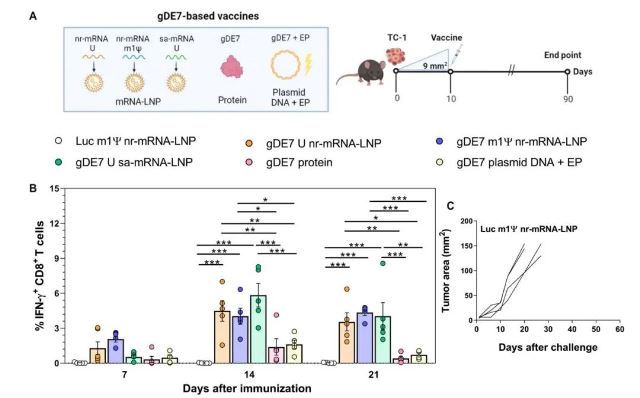 在这项最新研究中,研究团队使用这三种mRNA疫苗平台,制备了编码1型单纯疱疹病毒(HSV-1)糖蛋白D(gD)和HPV-16 E7癌蛋白(E7)融合的嵌合蛋白的mRNA疫苗,同样使用脂质纳米颗粒(LNP)进行递送。紧接着,在已被广泛研究的实验性HPV相关肿瘤模型的基础上,研究小组对三种编码相同靶抗原的mRNA疫苗的诱导免疫反应和治疗效果进行了详细的比较分析。