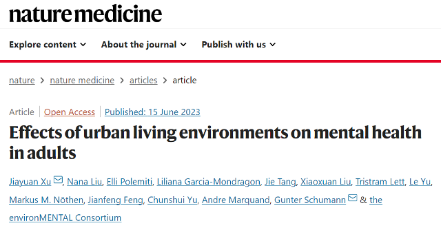 2023年6月15日,复旦大学类脑智能科学与技术研究院Gunter Schumann教授、天津医科大学总医院徐佳圆博士等在国际顶尖医学期刊 Nature Medicine 上发表了题为:Effects of urban living environments on mental health in adults 的研究论文。