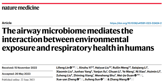 原文出处:Lin L, Yi X, Liu H, Meng R, Li S, Liu X, Yang J, Xu Y, Li C, Wang Y, Xiao N, Li H, Liu Z, Xiang Z, Shu W, Guan WJ, Zheng XY, Sun J, Wang Z. The airway microbiome mediates the interaction between environmental exposure and respiratory health in humans. Nat Med. 2023 Jun 22. doi: 10.1038/s41591-023-02424-2. Epub ahead of print. PMID: 37349537.