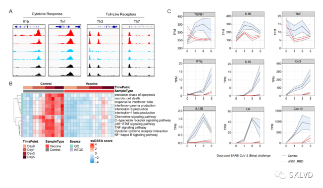 图2.训练免疫在广谱保护中发挥重要作用:A.抗病毒固有免疫基因染色质开放性增加;B.预防组织过度炎症反应;C.维持肺部免疫稳态