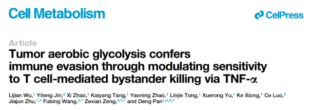 2023年7月27日,清华大学医学院潘登团队、北京大学定量生物学中心(CQB)、北大-清华生命科学联合中心曾泽贤团队与武汉大学中南医院汪付兵团队合作,在 Cell Metabolism 期刊发表了题为:Tumor aerobic glycolysis confers immune evasion through modulating sensitivity to T cell-mediated bystander killing via TNFα 的研究论文。
