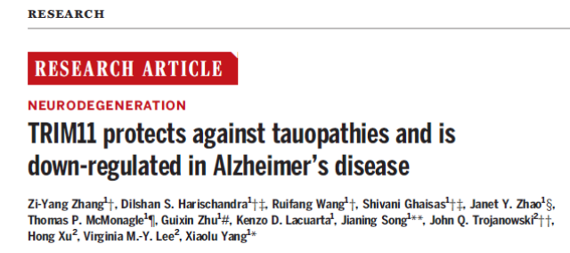 原文出处:Zhang ZY, Harischandra DS, Wang R, Ghaisas S, Zhao JY, McMonagle TP, Zhu G, Lacuarta KD, Song J, Trojanowski JQ, Xu H, Lee VM, Yang X. TRIM11 protects against tauopathies and is down-regulated in Alzheimer's disease. Science. 2023 Jul 28;381(6656):eadd6696. doi: 10.1126/science.add6696. Epub 2023 Jul 28. PMID: 37499037.