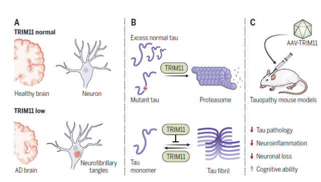 2023年7月28日,由宾夕法尼亚大学佩雷尔曼医学院杨小鲁教授领导的研究小组在Science杂志上发表题为TRIM11 protects against tauopathies and is down-regulated in Alzheimer’s disease的研究论文,发现三重基序蛋白TRIM11可以有效抑制 tau 聚集并维持神经元的活力和连接性,TRIM11在阿尔茨海默病人大脑中显著下调,而通过腺相关病毒(AAV)颅内递送 TRIM11 可改善多种 tau蛋白病动物模型的病理、神经炎症和认知障碍。该研究表明 TRIM11 下调有可能是tau蛋白病产生的一个重要原因,恢复 TRIM11 表达可能代表一种对这些疾病的有效治疗策略。