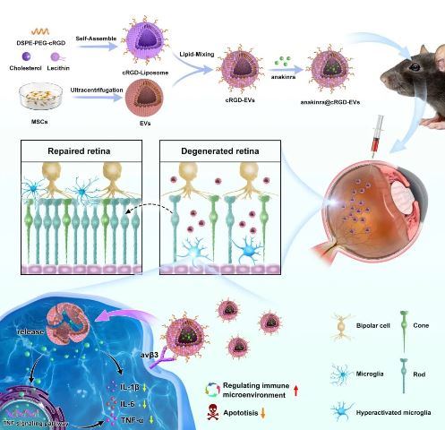 图:工程化anakinra@cRGD-EVs的制备及其通过免疫微环境操作,促进视网膜变性的靶向修复示意图