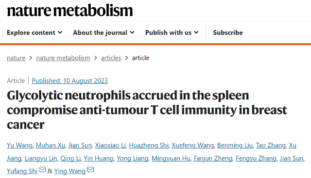 2023年8月10日,中国科学院上海营养与健康研究所王莹团队与时玉舫团队合作,在 Nature Metabolism 期刊发表了题为:Glycolytic neutrophils accrued in the spleen compromise anti-tumour T cell immunity in breast cancer 的研究论文。