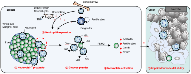 乳腺癌病理进程中,脾脏嗜中性粒细胞的聚集通过剥夺葡萄糖,借以PKM2-STAT5通路削弱T细胞抗肿瘤免疫应答