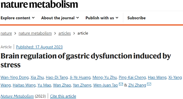 原文出处:Dong WY, Zhu X, Tang HD, Huang JY, Zhu MY, Cheng PK, Wang H, Wang XY, Wang H, Mao Y, Zhao W, Zhang Y, Tao WJ, Zhang Z. Brain regulation of gastric dysfunction induced by stress. Nat Metab. 2023 Aug 17. doi: 10.1038/s42255-023-00866-z. Epub ahead of print. PMID: 37592008.