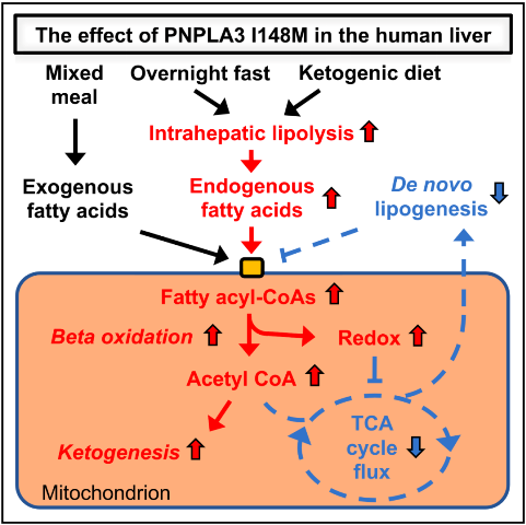 PNPLA3是一种主要在肝脏和脂肪组织中表达的脂筏蛋白,负责将甘油三酯中的不饱和脂肪酸转移到磷脂中,而I148M突变会损害这一功能。由于脂肪肝是脂肪酸合成和分解途径失调的结果,所以作者首先对PNPLA3的I148M突变携带者的脂肪从头合成途径(de novo lipogenesis, DNL)和酮体生成途径进行研究。该临床报告中共招募了19位I149M纯合突变携带者,以及36位非突变携带者(对照组),并且保证这些受试人员的年龄、性别、BMI、空腹血糖、非酯化脂肪酸(non-esterified fatty acid, NEFA)和血清胰岛素水平处于一致的状态。通过最先进的稳定同位素技术,研究I148M组和对照组人群的各项肝脏指标。