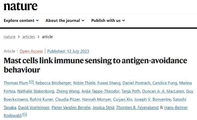 [1] Plum, T., Binzberger, R., Thiele, R. et al. Mast cells link immune sensing to antigen-avoidance behaviour. Nature 620, 634–642 (2023). https://doi.org/10.1038/s41586-023-06188-0