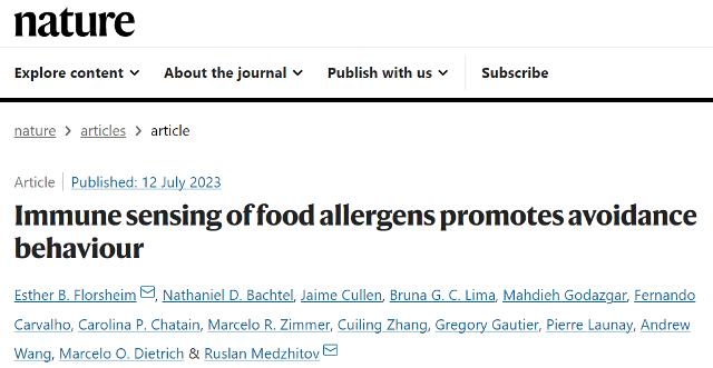 [2] Florsheim, E.B., Bachtel, N.D., Cullen, J.L. et al. Immune sensing of food allergens promotes avoidance behaviour. Nature 620, 643–650 (2023). https://doi.org/10.1038/s41586-023-06362-4