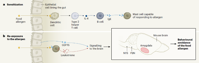 2023年7月,国际顶尖学术期刊 Nature 同期发表了两篇研究论文,这两项研究表明,参与过敏反应的免疫系统(肥大细胞)通过与大脑沟通,从而导致食物回避,而这种行为有助于避免有害的过敏原。