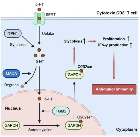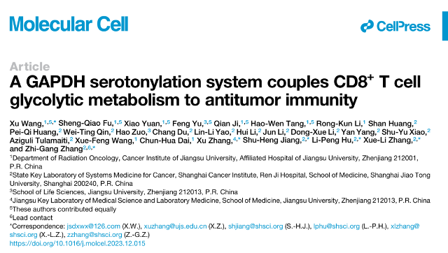 2024年1月11日,上海交通大学医学院附属仁济医院上海市肿瘤研究所肿瘤系统医学全国重点实验室张志刚课题组和江苏大学附属医院肿瘤研究院放疗科王旭课题组在 Molecular Cell 杂志发表了题为 A GAPDH serotonylation system couples CD8+ T-cell glycolytic metabolism to antitumor immunity 的研究论文,该工作详细系统性阐述了GAPDH 5-HT化翻译后修饰通过促进CD8+ T细胞免疫功能增强其抗肿瘤活性的机制。