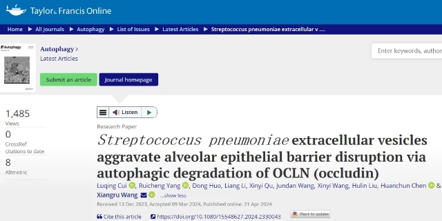 原文出处:Cui L, Yang R, Huo D, Li L, Qu X, Wang J, Wang X, Liu H, Chen H, Wang X. Streptococcus pneumoniae extracellular vesicles aggravate alveolar epithelial barrier disruption via autophagic degradation of OCLN (occludin). Autophagy. 2024 Apr 21:1-20. doi: 10.1080/15548627.2024.2330043. Epub ahead of print. PMID: 38497494.