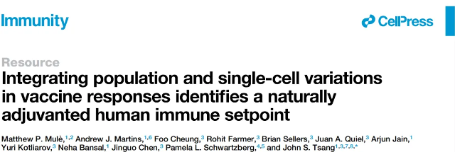 2024年5月1日,来自美国NIH的John S. Tsang研究组在Immunity上发表题为Integrating population and single-cell variations in vaccine responses identifies a naturally adjuvanted human immune setpoint的文章,就上述瓶颈进行了深入探索。