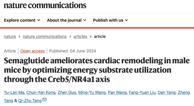 原文出处:Ma YL, Kong CY, Guo Z, Wang MY, Wang P, Liu FY, Yang D, Yang Z, Tang QZ. Semaglutide ameliorates cardiac remodeling in male mice by optimizing energy substrate utilization through the Creb5/NR4a1 axis. Nat Commun. 2024 Jun 4;15(1):4757. doi: 10.1038/s41467-024-48970-2. PMID: 38834564; PMCID: PMC11150406.