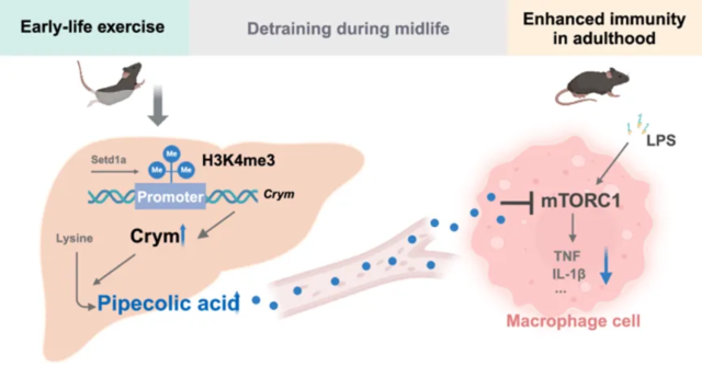 该研究发现在生命早期进行游泳训练可以抑制雄性小鼠对脂多糖(LPS)的炎症反应,减轻脓毒症的严重程度,并促进中年期的恢复,即使是在长时间的脱训练后。这一持久的免疫调节获益归因于免疫代谢网络的表观遗传调节,其中哌啶酸被认为是一个重要因素。总之,研究结果表明,生命早期规律运动可增强小鼠的抗炎免疫,直至中年期。这一持久益处是由免疫代谢网络信号通路的表观遗传调节介导的,其中哌啶酸发挥了关键作用。这凸显了早期有规律的身体活动对晚年免疫健康的重要性。