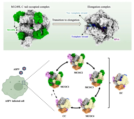 本研究利用亲和标签和蔗糖密度梯度离心纯化了感染状态下的内源ASFV RNAP,解析了多种天然构象的高分辨率冷冻电镜结构。此外,利用ASFV早期转录基因片段模拟转录泡结构,获得了转录延伸状态下的构象。体外功能实验表明,内源ASFV RNAP可以利用转录泡在体外延伸引物链。ASFV RNAP与经典RNAP的核心结构相似,但在外表面有一些独特的区域,可能介导与特定转录因子的相互作用。尤其是发现了一个独特的亚基M1249L,其结构类似于一个“笼子”,将核心亚基包裹在里面,与核心亚基形成了广泛的相互作用,稳定ASFV RNAP的整体结构。M1249L由多个结构域组成,与核心亚基动态结合,形成了多种构象,不同构象间可能互相转换,代表着不同的转录状态。M1249L C末端结构域深深地插入RNAP内部,占据了核酸结合位点。与牛痘病毒RNA聚合酶全复合体的结构分析表明,M1249L的结合导致多种经典转录因子的结合受阻。因此,M1249L作为ASFV特有的转录因子,稳定ASFV RNAP的整体结构,并通过动态结合机制调控ASFV RNAP的活性。这些研究结果不仅发现了天然状态下ASFV RNAP独特的结构特征,还为ASFV防控疫苗和药物的研发提供了理论基础。