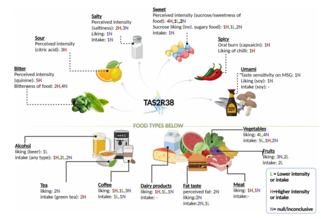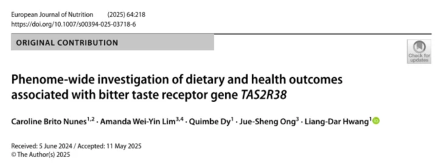 原文出处:Brito Nunes C, Lim AW, Dy Q, Ong JS, Hwang LD. Phenome-wide investigation of dietary and health outcomes associated with bitter taste receptor gene TAS2R38. Eur J Nutr. 2025 Jun 11;64(5):218. doi: 10.1007/s00394-025-03718-6. PMID: 40498099; PMCID: PMC12158849.