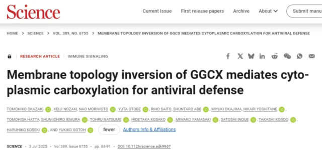 原文出处:Okazaki T, Nozaki K, Morimoto N, Otobe Y, Saito R, Abe S, Okajima M, Yoshitane H, Hatta T, Iemura SI, Natsume T, Kosako H, Yamasaki M, Inoue S, Kondo T, Koseki H, Gotoh Y. Membrane topology inversion of GGCX mediates cytoplasmic carboxylation for antiviral defense. Science. 2025 Jul 3;389(6755):84-91. doi: 10.1126/science.adk9967. Epub 2025 Jul 3. PMID: 40608933.