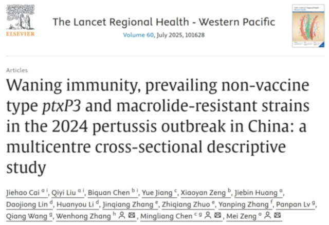 2025年7月,复旦大学张文宏团队,联合复旦大学陈明亮团队和曾玫团队,在Lancet子刊在线发表题为“Waning immunity, prevailing non-vaccine type ptxP3 and macrolide-resistant strains in the 2024 pertussis outbreak in China: a multicentre cross-sectional descriptive study”的研究性论文。