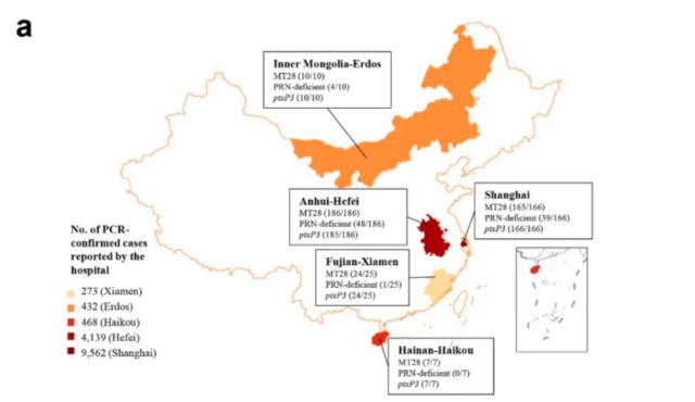 图1. 各省/市PCR确诊病例分布,分离株数量属于MT28克隆型、prn缺陷型和ptxP3型