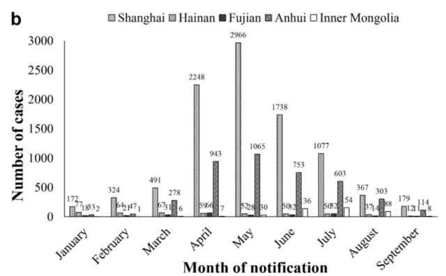 2024年1月1日至9月30日,中国五家哨点医院共报告14,874例PCR确诊的百日咳病例,主要集中在华东地区的上海(9562例)和安徽(4139例),呈现春季上升、4–7月高峰的季节性趋势;而华南及内蒙古地区病例相对较少,且流行峰值时间不同。