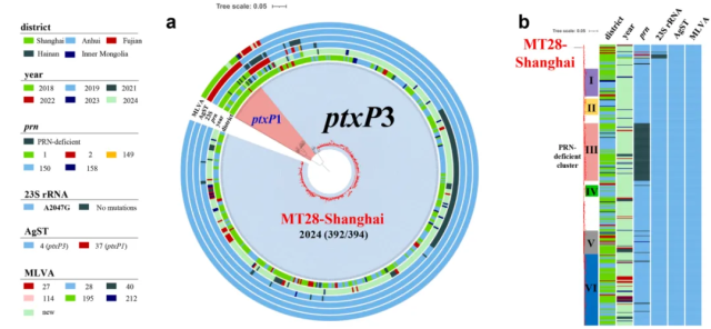 研究证明免疫疫苗保护的减弱以及以多抗性MT28克隆为代表的非疫苗型pxtP3菌株的盛行,是导致2024年中国百日咳大规模暴发的主要原因。研究强调当前迫切需要修订国家百日咳疫苗接种策略,以及调整传统的一线抗生素治疗方案。对于4-6岁儿童进行加强免疫接种,已成为控制此次百日咳疫情的紧迫措施。