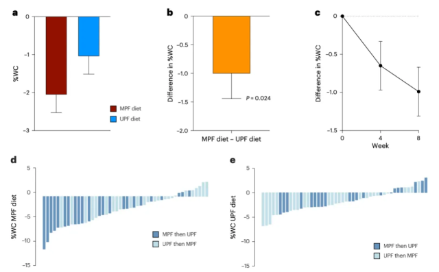 研究团队发现,在两个饮食阶段中,参与者的体重和体重指数(BMI)都有所下降。然而,参与者在超加工食品(UPF)饮食期间平均减重 0.88 公斤,而在最低程度加工食品(MPF)饮食期间平均减重 1.84 公斤。在 MPF 饮食期间,与心血管代谢健康指标有关身体成分发生了变化——脂肪总量、体脂率、内脏脂肪及甘油三酯都有所下降,而在 UPF 饮食期间则没有这种变化。此外,在 MPF 饮食期间,食欲也有所下降。