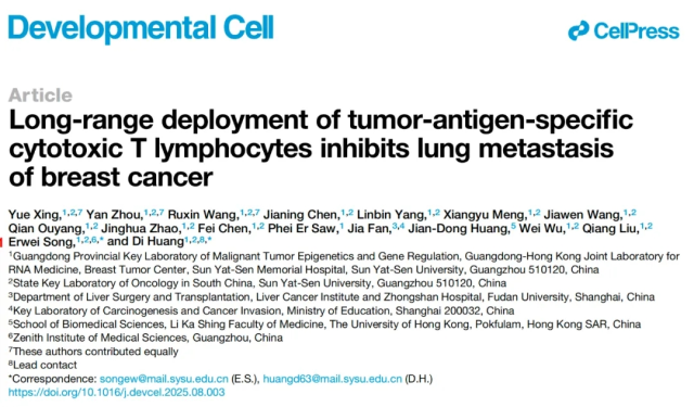 2025 年 8 月 27 日,中山大学孙逸仙纪念医院宋尔卫院士、黄迪博士作为共同通讯作者,在 Cell 子刊 Developmental Cell 上发表了题为:Long-range deployment of tumor-antigen-specific cytotoxic T lymphocytes inhibits lung metastasis of breast cancer 的研究论文。