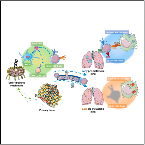 研究团队进一步在小鼠癌症模型中发现,CD103+ CD8+ T 细胞在肿瘤引流淋巴结(TDLN)中被激活,并通过 CCL25/CCR9 信号转导,招募至肺部,通过抗原特异性免疫来抑制肿瘤转移。此外,来自肿瘤早期和晚期的细胞外囊泡(EV)分别使肺泡巨噬细胞极化,从而释放 CCL25 和 IDO1,而后者会抑制肺部 CD103+ CD8+ T 细胞的部署,从而促进肺转移。有效耗竭 IDO1 可恢复 CD103+ CD8+ T 细胞介导的对肺转移的保护作用。