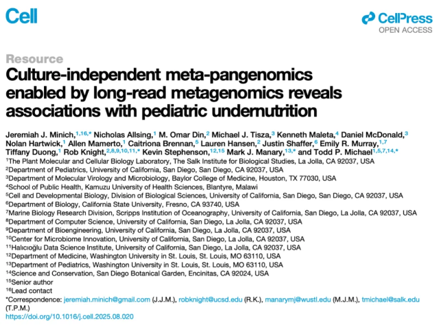 原文出处:Minich JJ, Allsing N, Din MO, Tisza MJ, Maleta K, McDonald D, Hartwick N, Mamerto A, Brennan C, Hansen L, Shaffer J, Murray ER, Duong T, Knight R, Stephenson K, Manary MJ, Michael TP. Culture-independent meta-pangenomics enabled by long-read metagenomics reveals associations with pediatric undernutrition. Cell. 2025 Sep 3:S0092-8674(25)00975-4. doi: 10.1016/j.cell.2025.08.020. Epub ahead of print. PMID: 40930091.