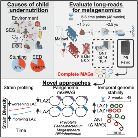 在马拉维的一个纵向儿科队列中,研究团队从 47 个样本中生成了 986 个微生物的完整或近乎完整的 cMAG(839 个为环状闭合的高质量基因组),并将此数据库应用于 210 个样本的扩展集。机器学习识别出了与线性生长相关的微生物物种。泛基因组分析揭示了微生物遗传与线性生长的关联,而基因组不稳定性与 LAZ 评分下降相关。这一资源展示了将 cMAG 与健康轨迹进行比较的强大之处,并为微生物组关联研究确立了新标准。