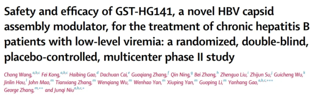 原文出处:Wang C, Kong F, Gao H, Cai D, Zhang G, Ning Q, Zhong B, Liu Z, Su Z, Wu G, Hou J, Mao J, Zhang T, Wu W, Yan W, Yan X, Li G, Gao Y, Zhang G, Niu J. Safety and efficacy of GST-HG141, a novel HBV capsid assembly modulator, for the treatment of chronic hepatitis B patients with low-level viremia: a randomized, double-blind, placebo-controlled, multicenter phase II study. EClinicalMedicine. 2025 Aug 2;87:103400. doi: 10.1016/j.eclinm.2025.103400. PMID: 40808966; PMCID: PMC12341701.