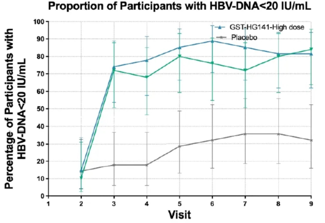 研究主要终点为24周时血清HBV DNA低于检测下限(< 20 IU/mL)的比例,GST-HG141低剂量组为84.0%(21/25)、高剂量组为81.5%(22/27),均显著优于安慰剂组32.1%(9/28),绝对差异分别为51.9%和49.3%(p<0.05)。