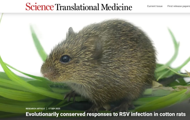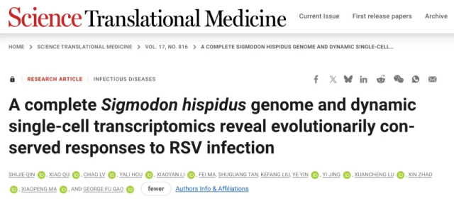 2025 年 9 月 17 日,高福院士、深圳市儿童医院麻晓鹏院长、中国科学院微生物研究所赵欣副研究员、中国疾病预防控制中心(中国预防医学科学院)卢选成研究员等在 Science 子刊 Science Translational Medicine 上发表了题为:A complete Sigmodon hispidus genome and dynamic single-cell transcriptomics reveal evolutionarily conserved responses to RSV infection 的研究论文,该研究还作为精选论文在期刊官网首页进行轮播展示。