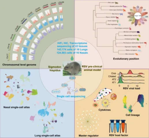 原文出处:Qin S, Qu X, Lv C, Hou Y, Li X, Ma F, Tan S, Liu K, Yin Y, Jing Y, Lu X, Zhao X, Ma X, Gao GF. A complete Sigmodon hispidus genome and dynamic single-cell transcriptomics reveal evolutionarily conserved responses to RSV infection. Sci Transl Med. 2025 Sep 17;17(816):eadw7535. doi: 10.1126/scitranslmed.adw7535. Epub 2025 Sep 17. PMID: 40961223.