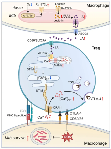 在该研究中,研究人员表明Mtb Rv1272c(一种ATP结合盒转运蛋白)的表达在缺氧条件下增加,并通过增加卵磷脂的输入,随后产生和释放亚油酸来促进Mtb在体内的存活。被感染的巨噬细胞释放的亚油酸通过Ca2+转运蛋白ATP2a3促进Treg细胞中免疫检查点分子细胞毒性T淋巴细胞抗原4 (CTLA-4)的表面运输。这反过来抑制了巨噬细胞活性氧的产生,并促进了巨噬细胞内结核分枝杆菌的存活。Rv1272c诱导的亚油酸通过增加体内Treg细胞上CTLA-4表面运输进一步促进Mtb免疫逃避。在机制上,亚油酸与Treg细胞中的ATP2a3相互作用,并促进线粒体相关的内质网(ER)膜形成。这促进了内质网到线粒体的Ca2+转移和内质网中Ca2+的耗竭,并触发了储库操纵的钙进入,从而提高了胞质Ca2+水平,增加了Treg细胞中Ca2+依赖的CTLA-4表面运输。这些发现揭示了结核分枝杆菌可以利用代谢物来操纵宿主反应并促进其细胞内存活。