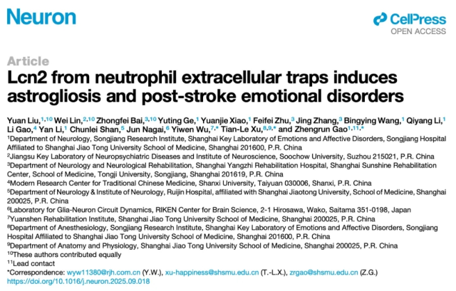 原文出处:Liu Y, Lin W, Bai Z, Ge Y, Xiao Y, Zhu F, Zhang J, Wang B, Li Q, Gao L, Li Y, Shan C, Nagai J, Wu Y, Xu TL, Gao Z. Lcn2 from neutrophil extracellular traps induces astrogliosis and post-stroke emotional disorders. Neuron. 2025 Oct 10:S0896-6273(25)00706-8. doi: 10.1016/j.neuron.2025.09.018. Epub ahead of print. PMID: 41075784.